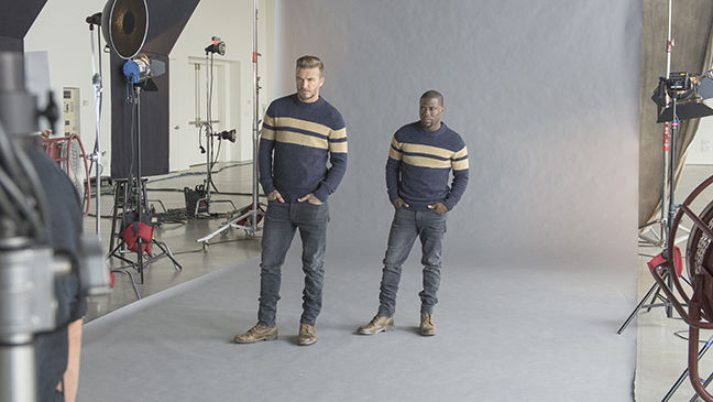 この冬流行る H Mキャンペーン撮影中のデビッド ベッカムとケヴィン ハート メンズセレブファッションニュース